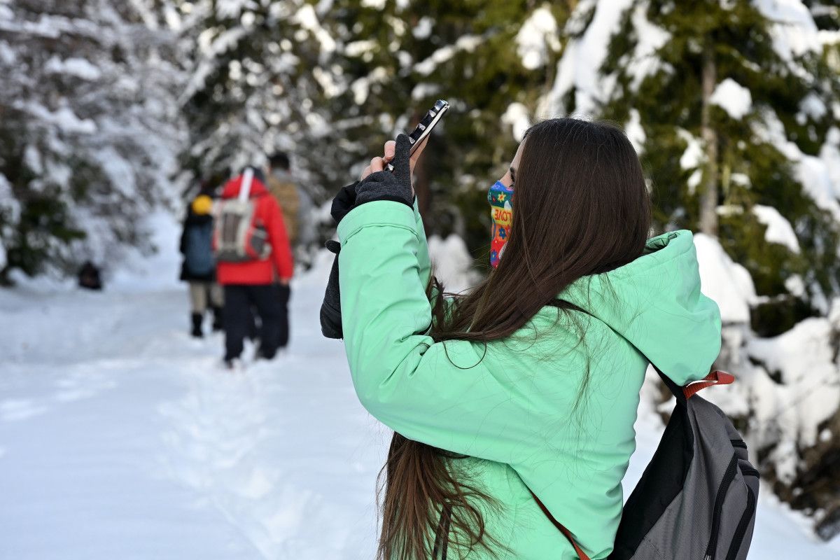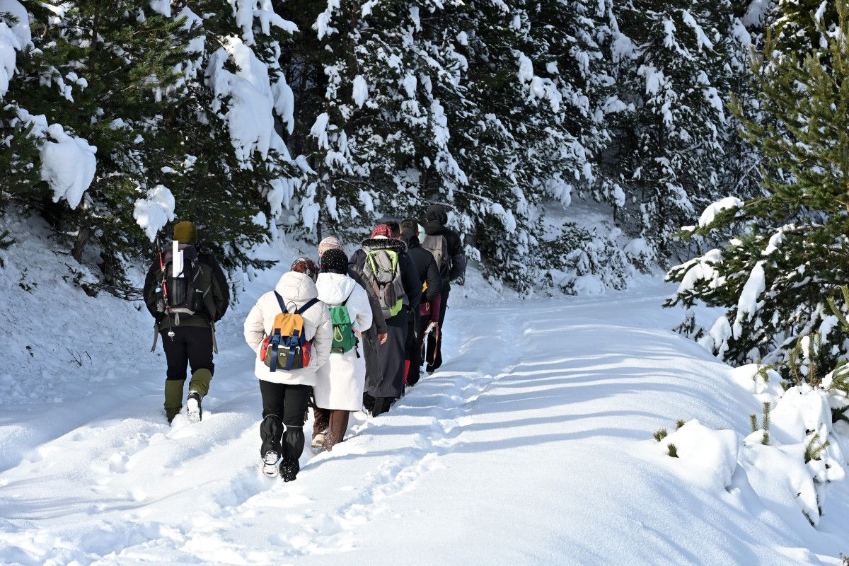 Kristalize kar taneleri eşliğinde ilerleyen ekip, orman içindeki yatay geçişlerde çam ağaçlarının üzerine çöken kar yükününün oluşturduğu masalsı görüntüleri bol bol fotoğrafladı.