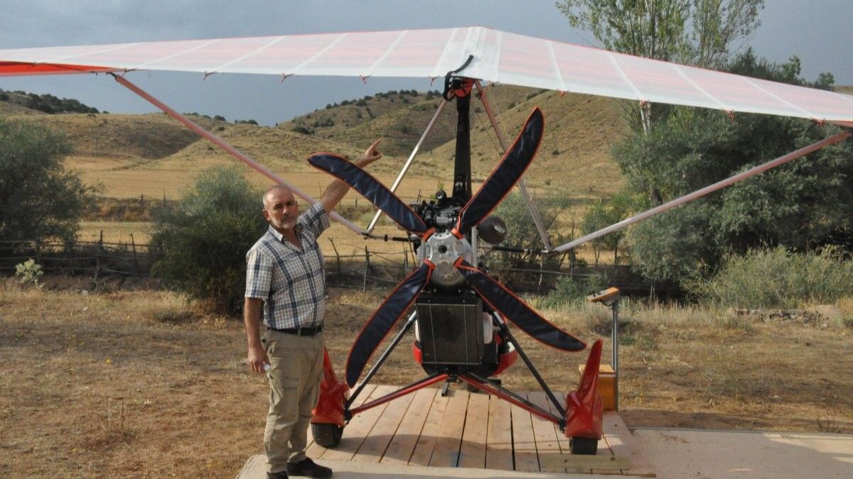 Yaklaşık 65 bin euro harcayan Celil Çiçek, 10 dönüm arazisini, hava aracının inip kalkacağı şekilde dizayn etti, bir de hangar inşa etti.