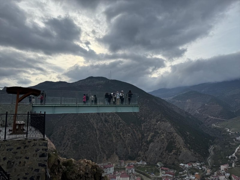 Gümüşhane'nin Torul ilçesinde 240 metre yüksekte kayalık üzerindeki cam seyir terasına çıkan yerli ve yabancı turistler manzarayı keyifle izliyor.