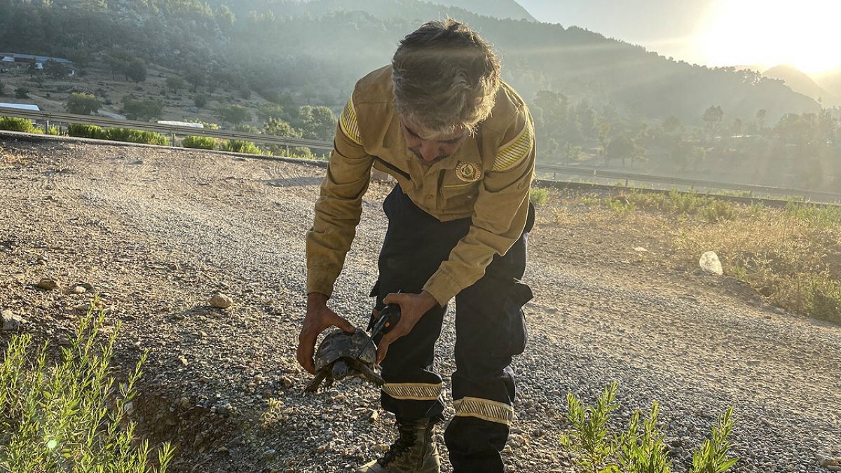 Sabah saatlerinde alevlerden kaçarak yol güzergahından ilerlemeye çalışan bir kaplumbağa Gündoğmuş Orman İşletme Müdürlüğü Şefi Ender Erol'un dikkatini çekti.