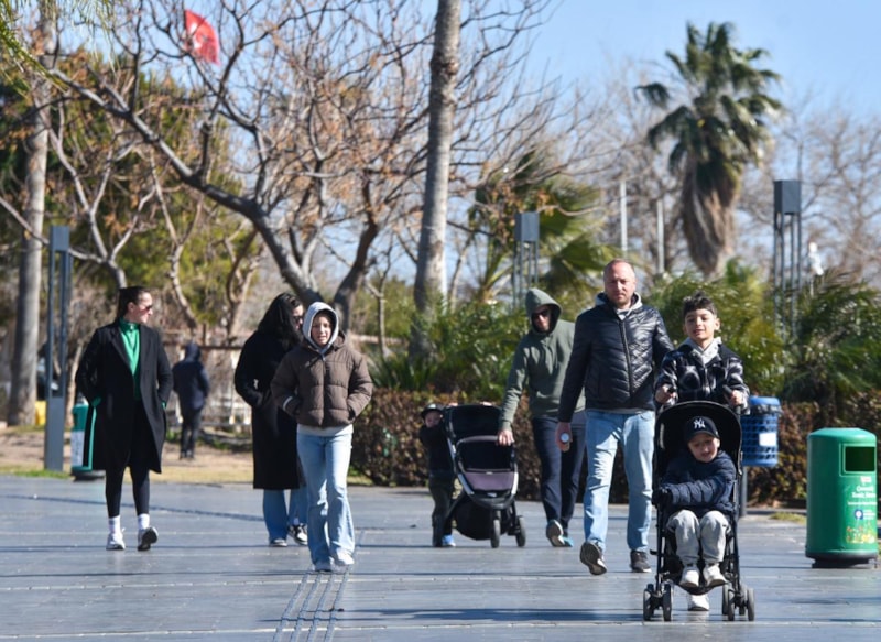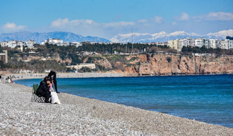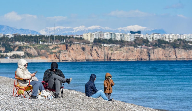 Rüzgarın soğuğu hissettirdiği Antalya'da güneşli havayı fırsat bilenler, dünyaca ünlü Konyaaltı Sahili'ne geldi.
