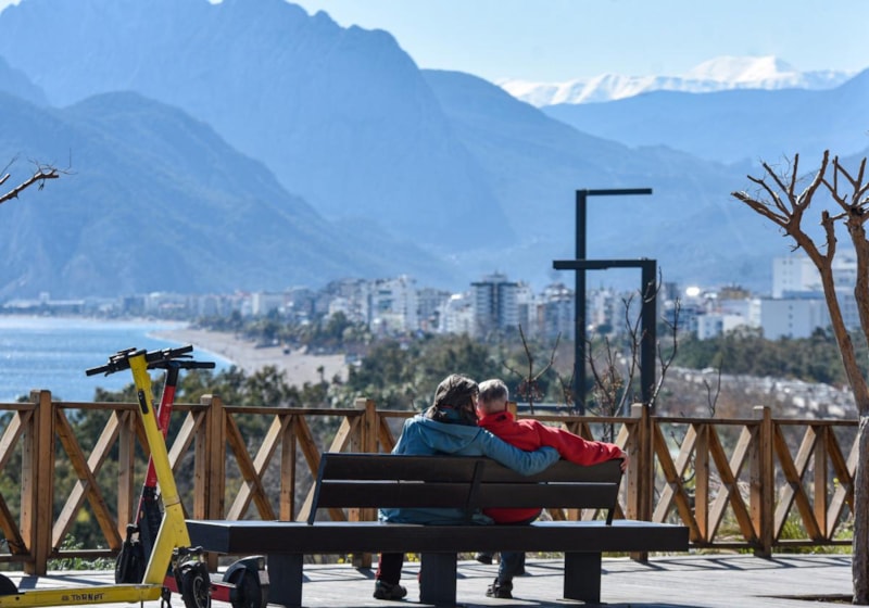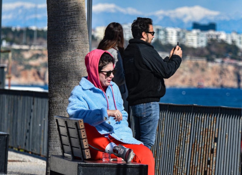 Antalya'da güneşli havayı fırsat bilerek Konyaaltı Sahili'ne gelenler, zirvesi karla kaplı Toros Dağları manzarası eşliğinde yürüyüp yapıp, vakit geçirdi.
