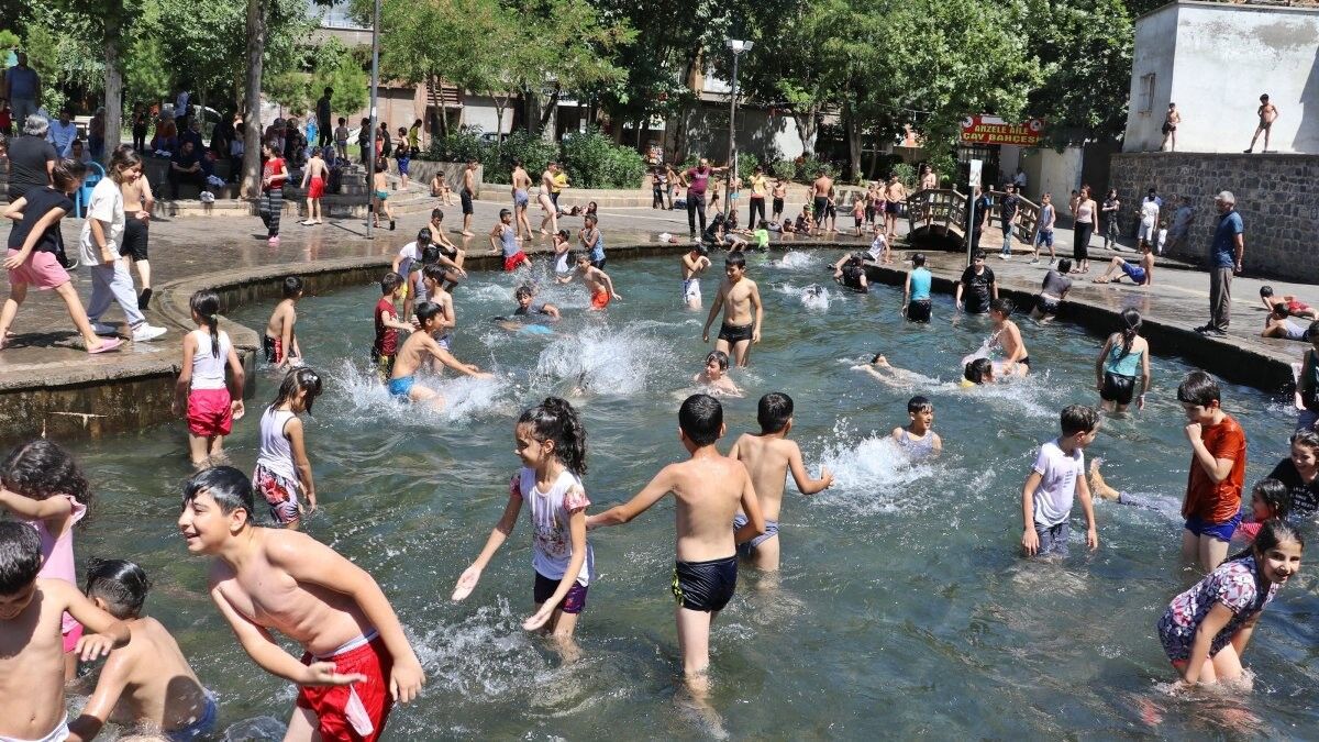 Bölgede hava sıcaklığıyla gündem olan bir diğer şehir ise Diyarbakır. Kentte çocuklar Sur ilçesinde bulunan Anzele Parkı’ndaki süs havuzunda serinlerken, yetişkinler de gölgelik alanları tercih etti.