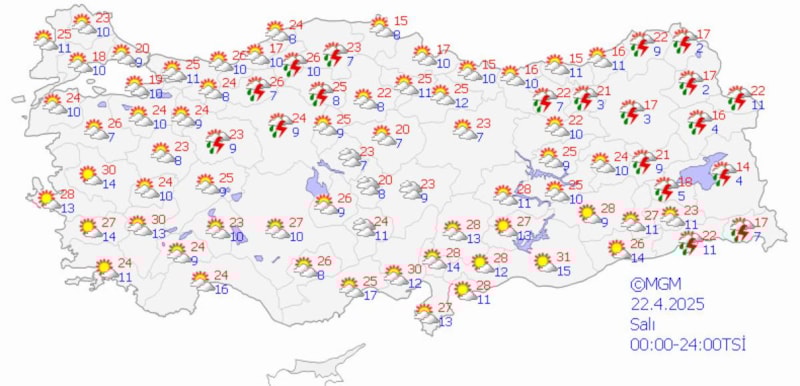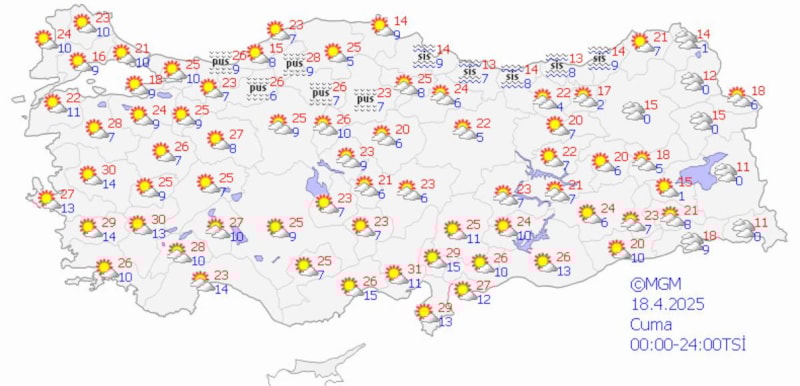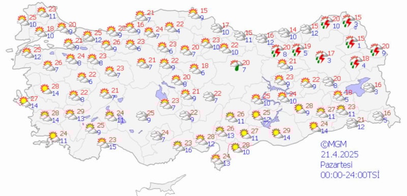 Eskişehir 21, Konya 25, Sivas 19, Kayseri 20 derece.