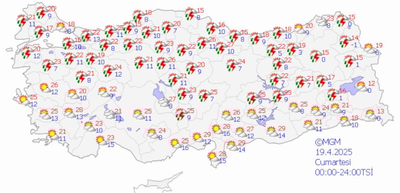 Meteoroloji haritalarına göre, 19 Nisan Cumartesi günü başta Marmara olmak üzere, Batı ve Orta Karadeniz, İç Anadolu’nun kuzeyi ile Doğu Anadolu’nun kuzeydoğusunda gök gürültülü sağanak yağışlar bekleniyor.