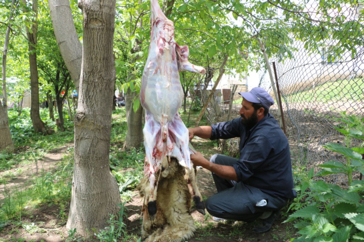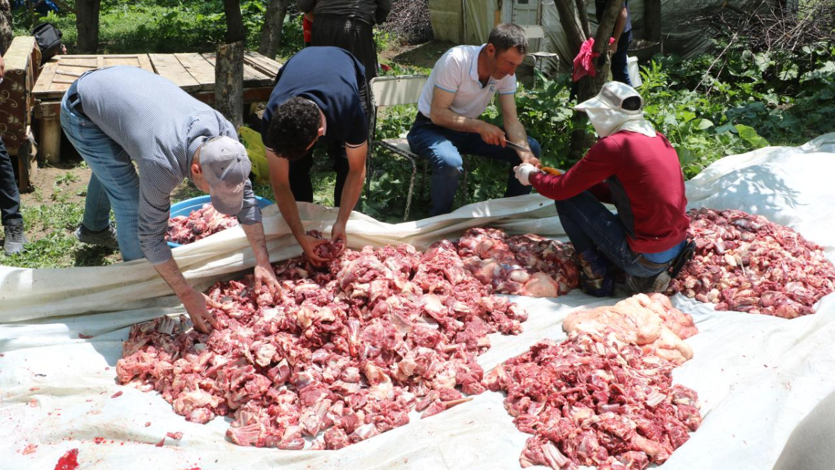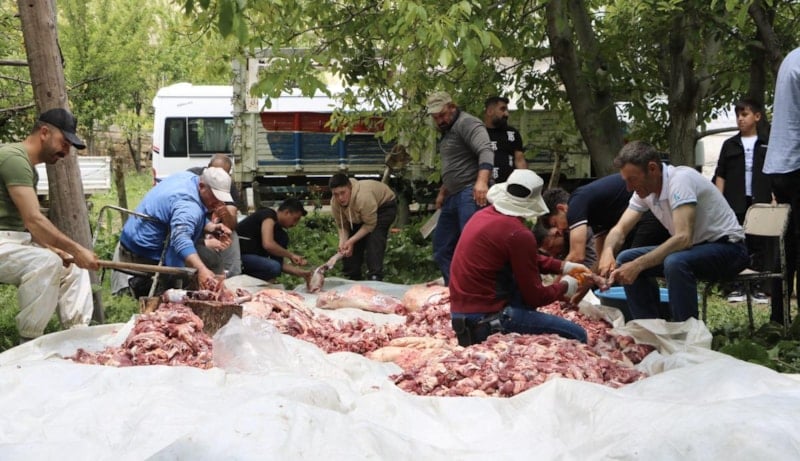 Bayram namazı sonrası, köy meydanına getirilen 100 küçükbaş hayvan kesilip, etleri eşit bir şekilde ayrıştırıldı.