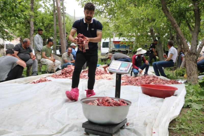 Yüksekova’da Kısıklı köyü sakinleri, yüz yıllık bayram geleneğini sürdürerek kestikleri 100 küçükbaş hayvanın etini eşit şekilde tüm köye dağıttı. Köylülerden Nedim Özdemir, bu gelenek sayesinde kurban kesen kesmeyen herkese eşit şekilde et dağıtıldığını belirtti.