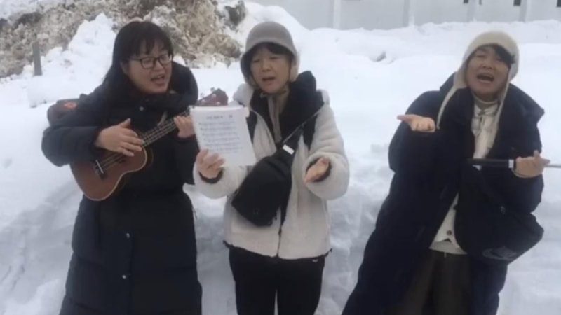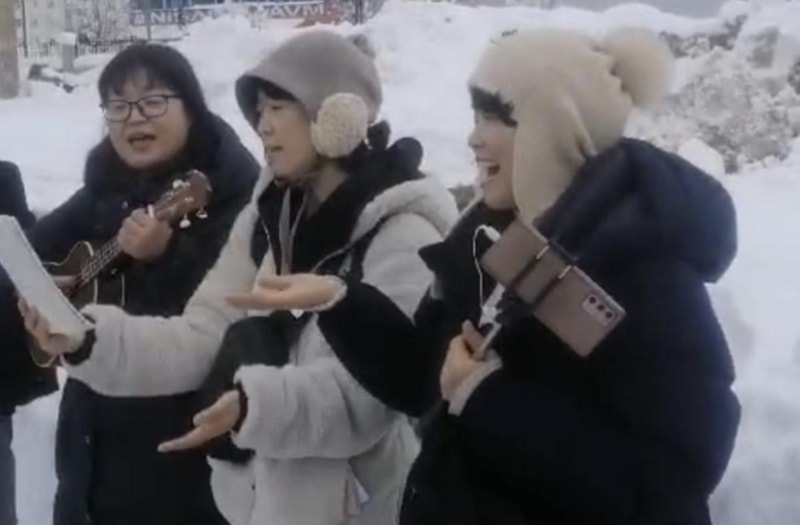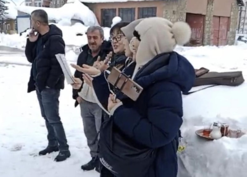 Yüksekova ilçesine gelen Güney Koreli turistler, kar çalışması öncesi ekiplere yöresel şarkılarını seslendirdi.
