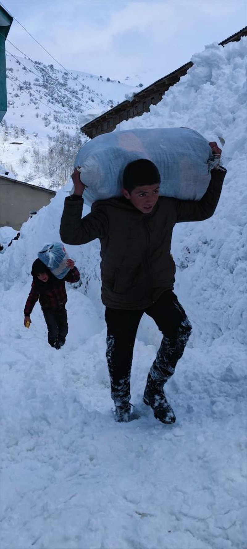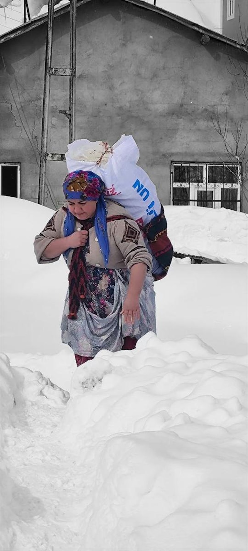 Depremzedelere yardım için Hakkari'de pişirilen ekmekleri köy içindeki yolların kapalı olması nedeniyle metrelerce sırtlarında taşıyarak ulaştırdılar.