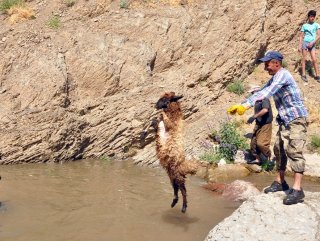 Hakkari'de koyunların yıkandığı gölette yüzme keyfi