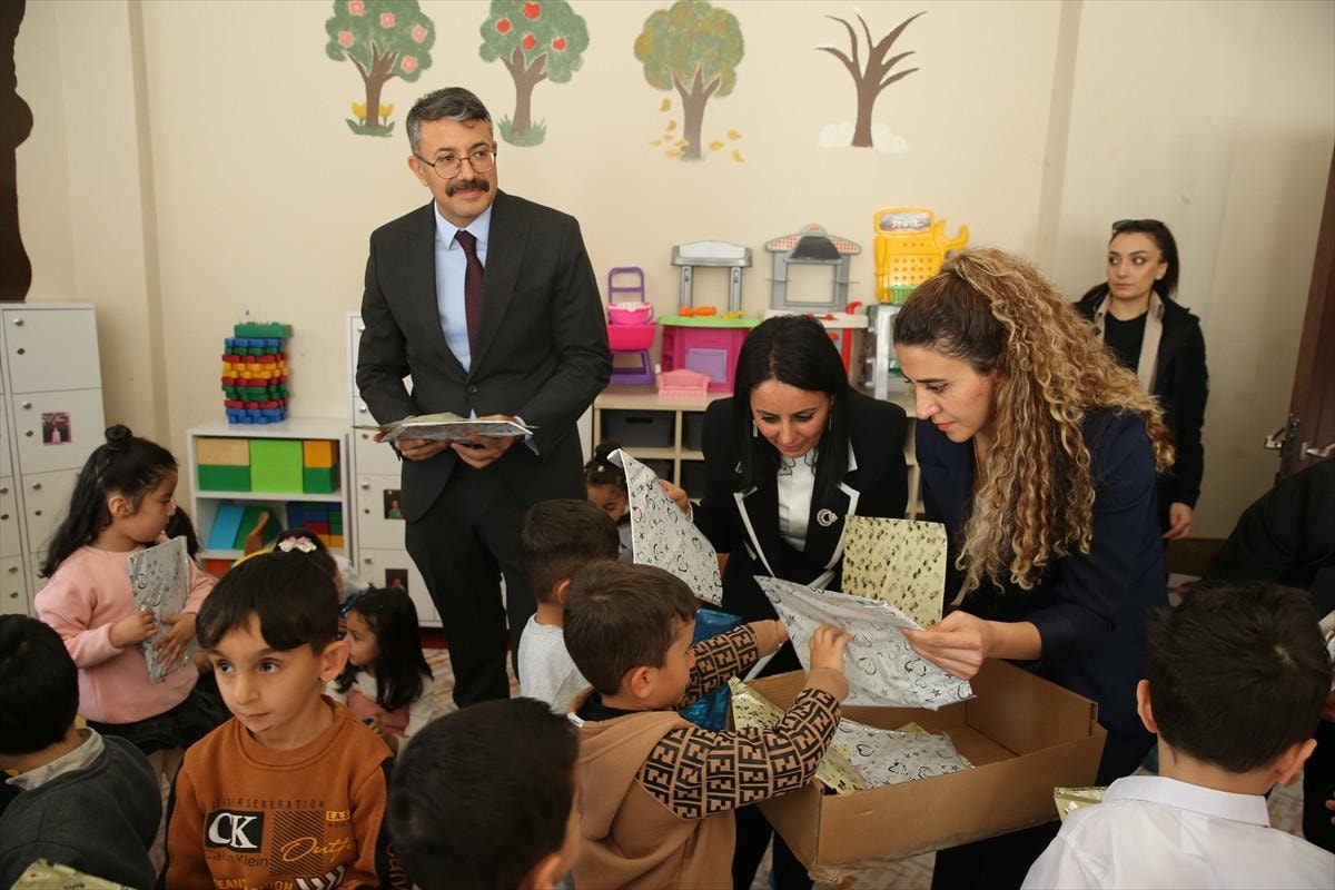 Vali Çelik ve katılımcılar, açılışını yaptıkları kütüphaneyi gezdi, bir araya geldikleri çocuklara hediye dağıttı.