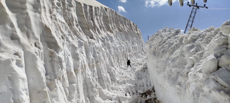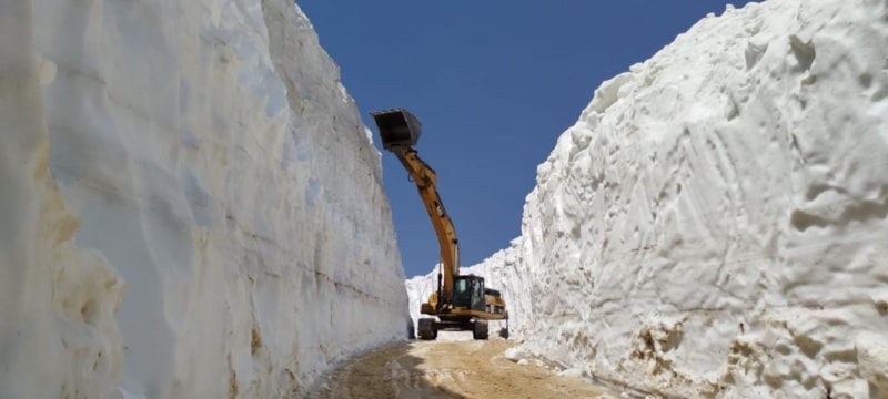 Kar kalınlığının yer yer 7-8 metreyi bulduğu bölgede zor şartlarda görev yapan ekipler, haziran ayı sonlarında olunmasına rağmen bazı noktalarda ekskavatör kullanarak ilerleyebiliyor.