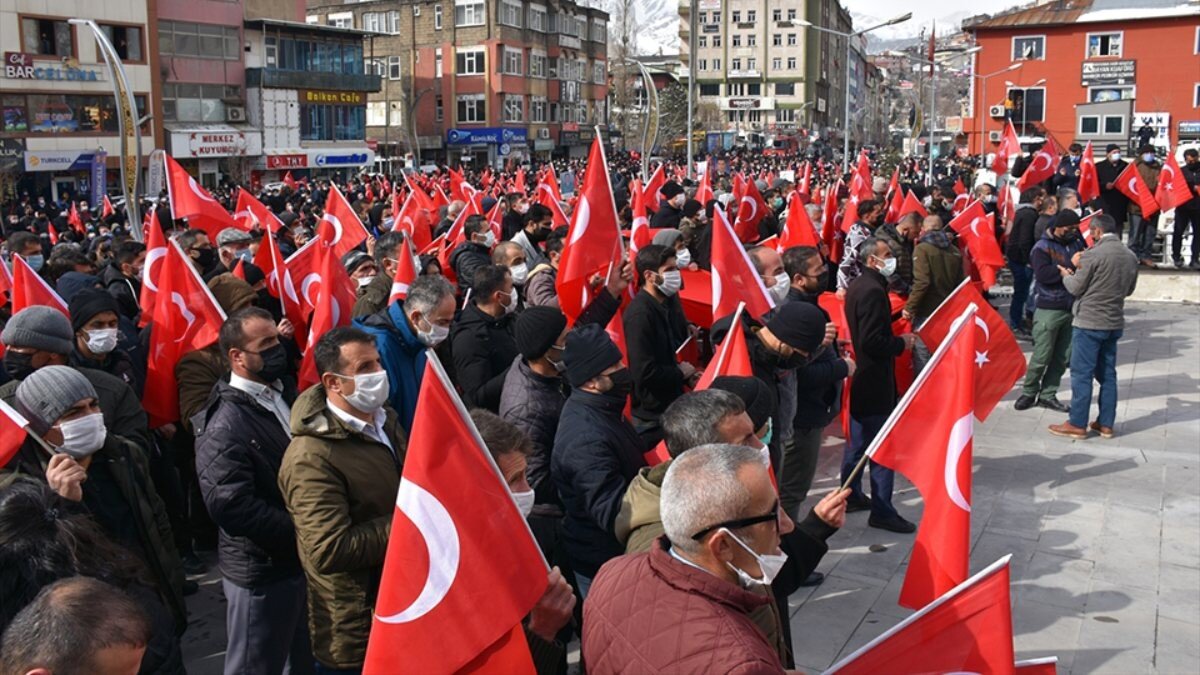 Hakkari'de, Pençe Kartal-2 Harekatı bölgesindeki Gara'da 13 Türk vatandaşını şehit eden terör örgütü PKK'ya tepki yürüyüşü düzenlendi.Düzenlenen yürüyüş için sivil toplum kuruluşu ve siyasi parti temsilcileri ile vatandaşlar, Bulvar Caddesi üzerinde bir araya geldi.