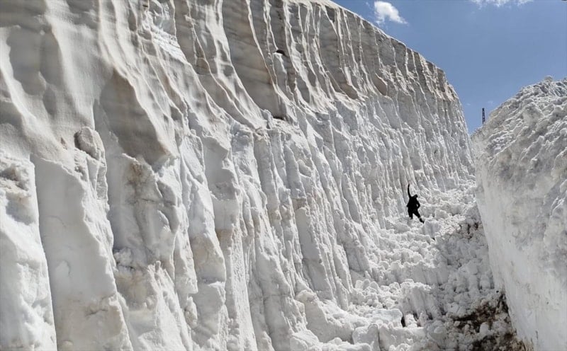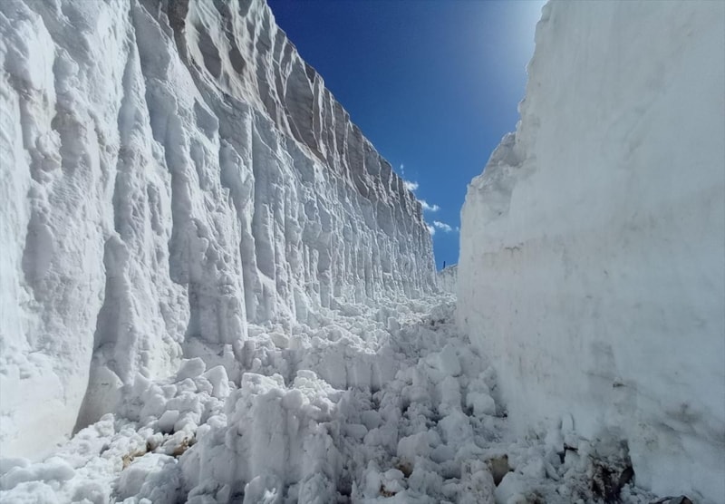 Yüksekova ilçesinde ekiplerin haziran ayında da karla mücadele çalışmaları devam ederken yer yer kar kalınlığı 8 metreyi aşıyor.