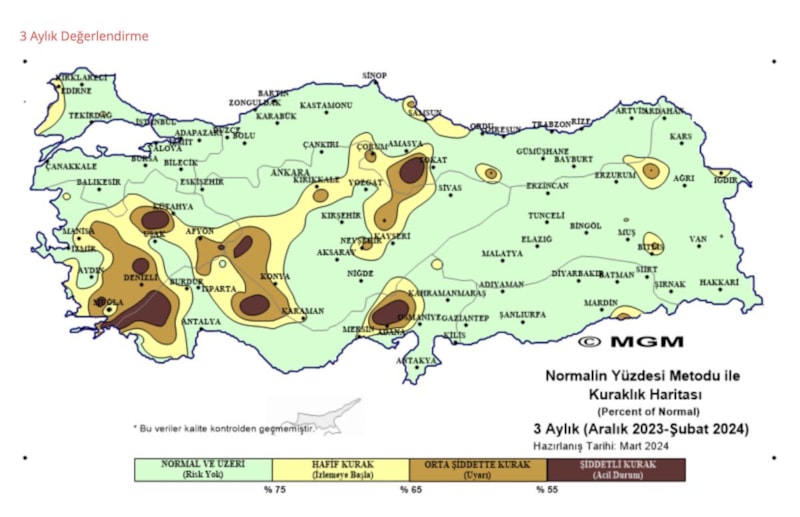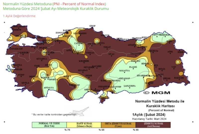 Çevre, Şehircilik ve İklim Değişikliği Bakanlığı'na bağlı Meteoroloji Genel Müdürlüğü'nün (MGM) normalin yüzdesi metoduna göre oluşturduğu, 2024 Şubat ayı meteorolojik kuraklık durumu haritası da Türkiye'deki kuraklık boyutunu gözler önüne serdi.