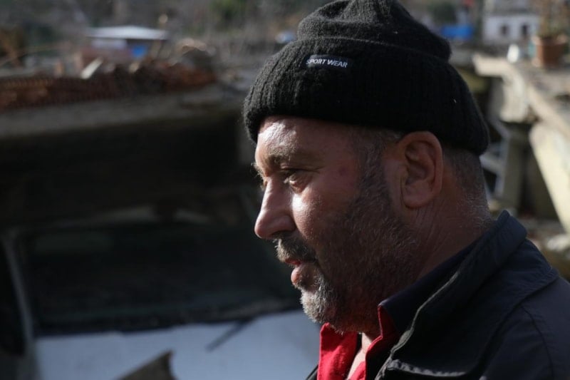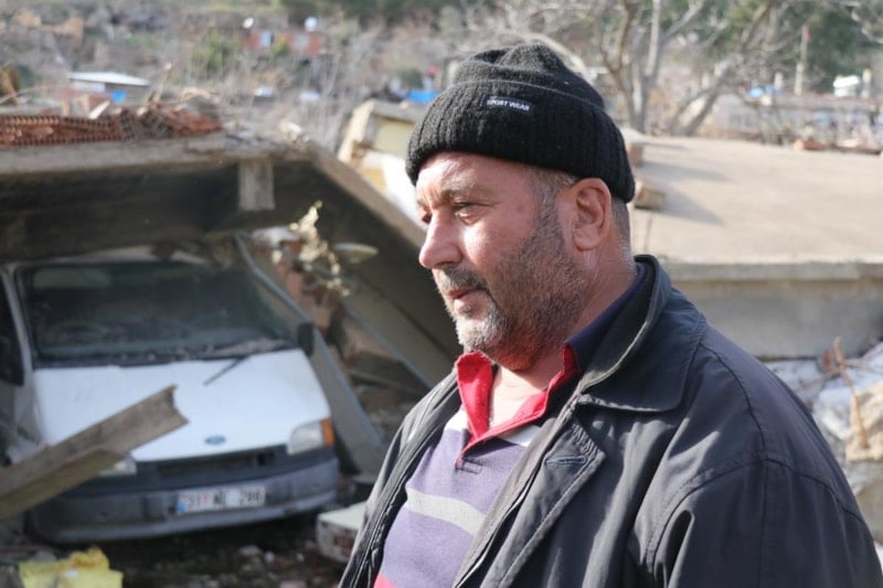 Deprem olduğunu ilk anda duyduk. O anda geçer diye bekledik, geçmeyince dışarı çıkmaya çalıştık. Tam merdivenlere geldiğimizde evimiz çöktü. Dört kişiydik. Gördüğünüz yerden buraya düştük. Beton da arabanın altında kaldı, bizi sıkışmaktan kurtardı. Traktör de enkazın altındaydı. Traktör ve minibüsün sayesinde biz canımızı kurtarmış olduk, o aradan çıktık. Eşim ve iki de oğlumlaydık. Ufak tefek sıyrıklarla çıktık. Hanımın kolunda kırık var, bir oğlumun başı yarıldı.