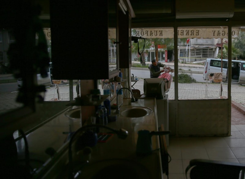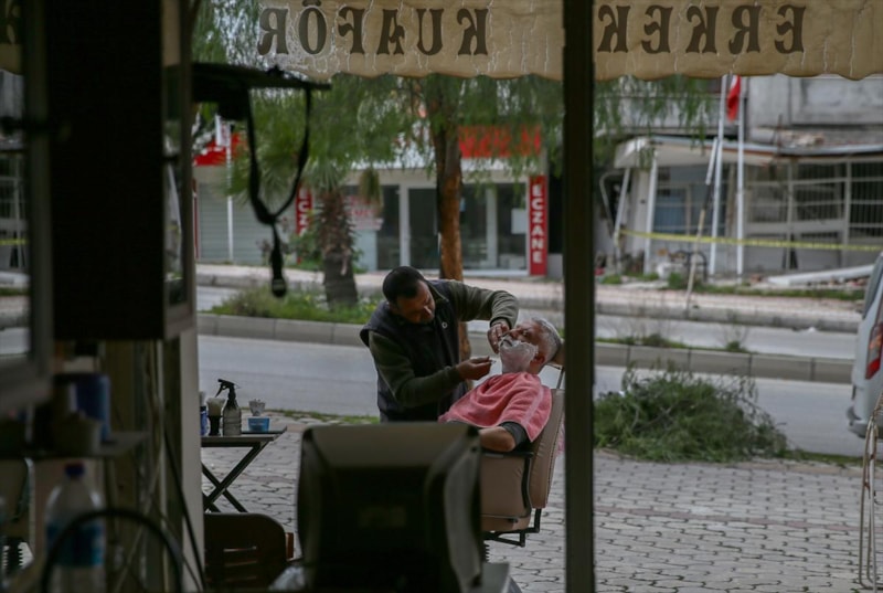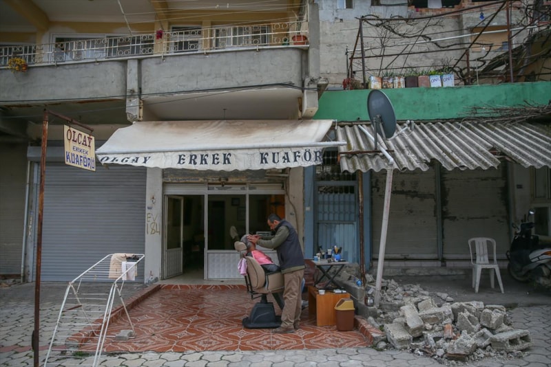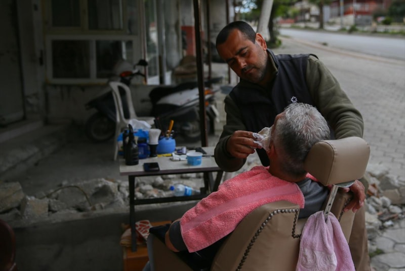 Deprem felaketinin yerle bir ettiği Defne ilçesinde, berber Olcay Duman, müşterilerini iş yerinin önünde tıraş etmeye başladı.