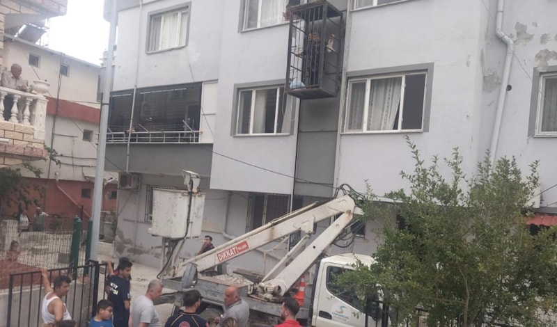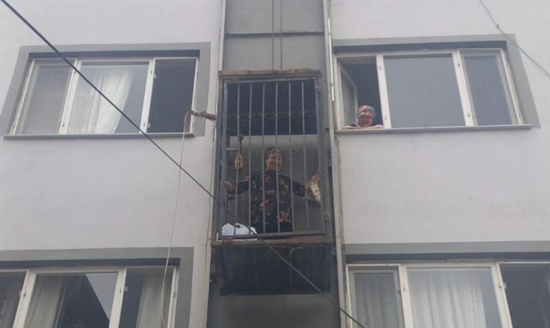 Dördüncü kattaki evinden aşağı inmek için asansörü kullanan kadın, kurtarılmak için itfaiye ekiplerinin gelmesini bekledi.
