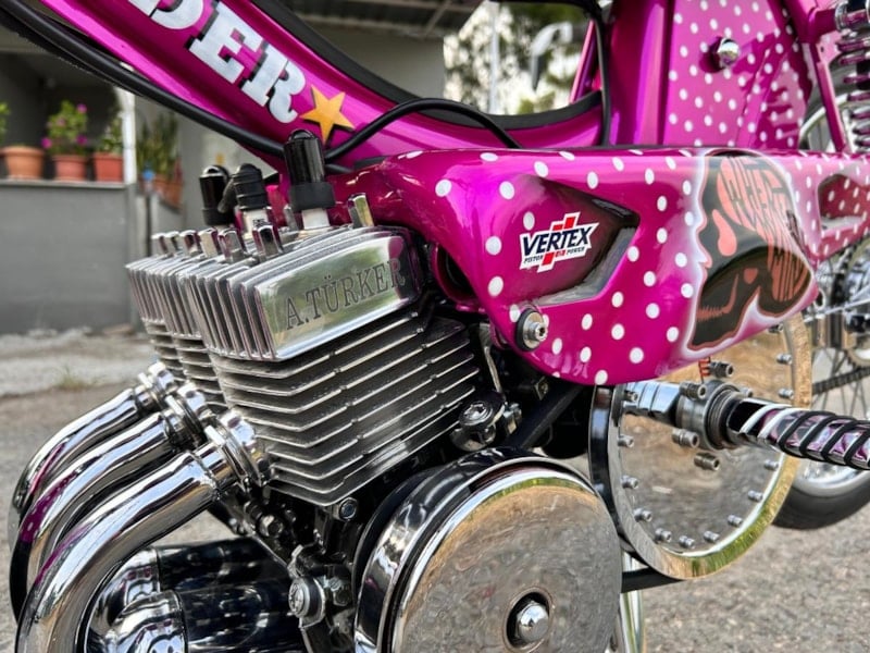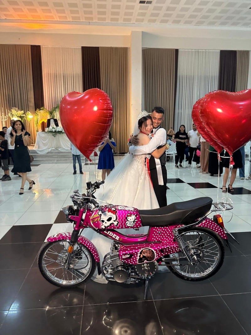 Kendi düğünlerinde eşine özel olarak yaptırdığı motosikleti hediye eden 28 yaşındaki Süleyman Türker, “Mobiletimiz özel tasarım yani alışmışın dışına çıkmak istedik. Herkes takı, araba ve lastik takıyor ben de mobilet vereyim dedi. Eşim de zaten motor tutkunu. Mobiletimiz 3 silindir 300 cc olarak geçiyor, özel üretimdir çok fazla emek verilmiştir.