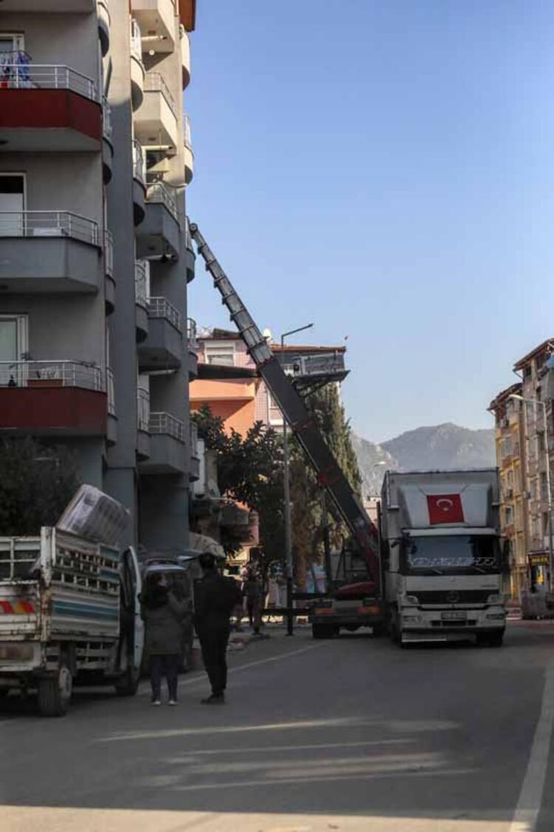 Bazı kişiler, eşyalarını iple aşağı sarkıtarak alırken, bazı binaların önüne yanaştırılan asansörlü sistemlerle de evler boşaltılıyor.