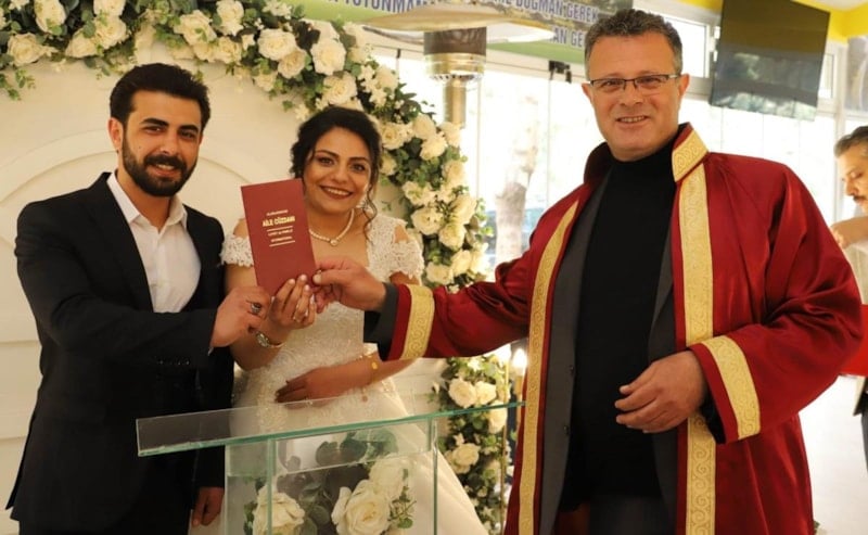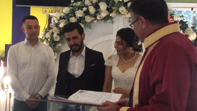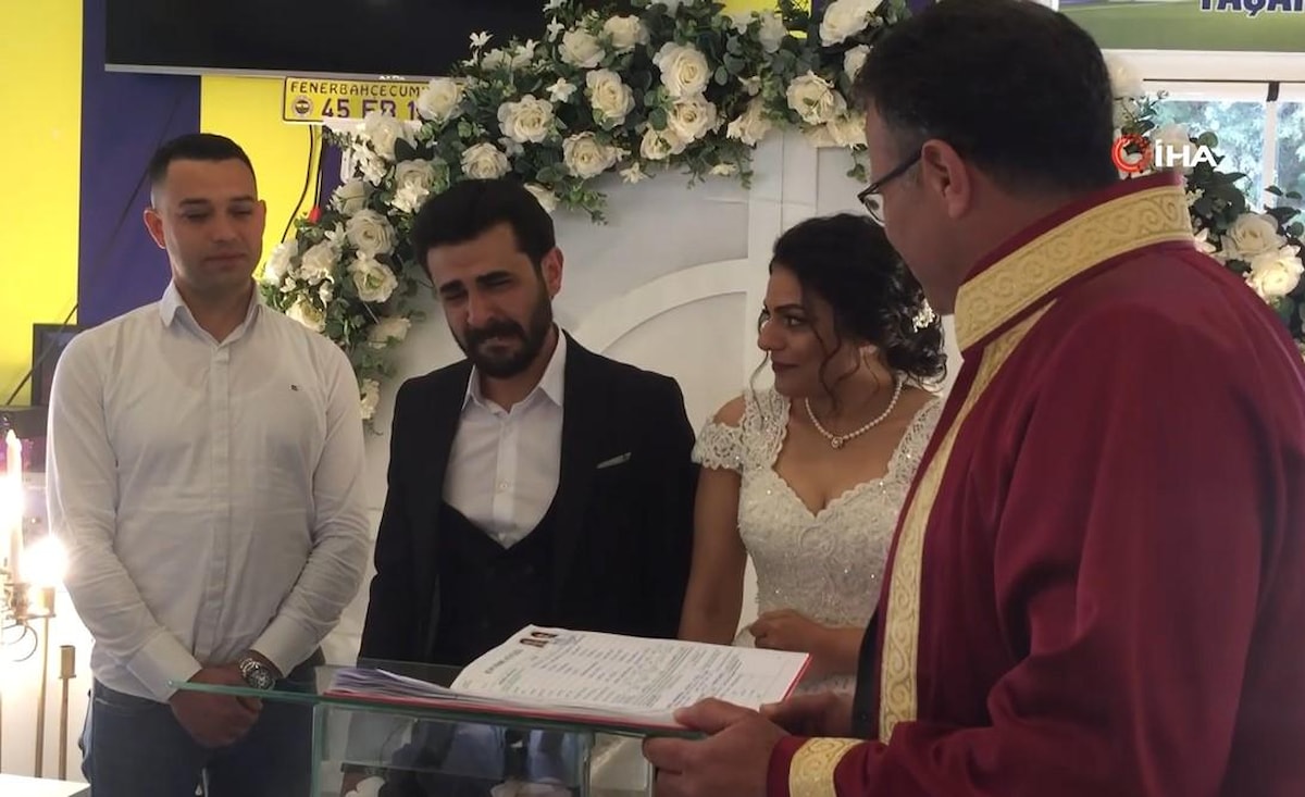 Enkazdan çıkarıldıktan sonra Alaşehir’de oturan akrabalarının yanına gelen Mehmet ve nişanlısı Dilara Kahraman, Alaşehir Belediye Başkanı Ahmet Öküzcüoğlu’nun kıydığı nikahla mutlu sona ulaştı.