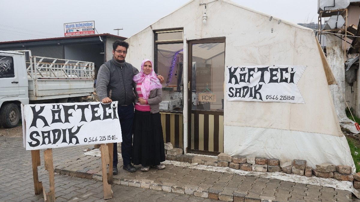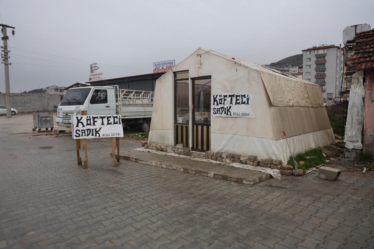 Depremde kaldıkları çadırı iş yerine dönüştüren baba Sadık Kodalak, "Depremden sonra bu çadırın içinde yaşıyorduk. Evimizin yanında sıkıntılı bir bina vardı. Sorunlu bina üzerimize yıkılma korkusuyla evimize geçemedik. Binayı yıkıp enkazını kaldırdıktan sonra evimize geçtik. Depremden sonra kaldığımız çadırı da iş yeri olarak kullanmaya başladık. Burada eşim ve çocuklarımla birlikte çalışıyoruz. Burada köftecilik yapıyoruz.