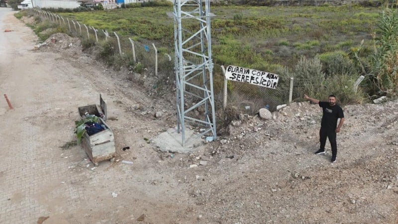 Vatandaşların çöpleri ve deprem sonrası yıkılan binaların hafriyat atıklarıyla kaplanan çöplerle başa çıkamayan Tancı, çözümü arazinin etrafında çevrili olan çitlere "Buraya çöp atan şerefsizdir" yazılı tabelayı asarak buldu.