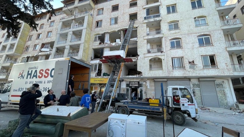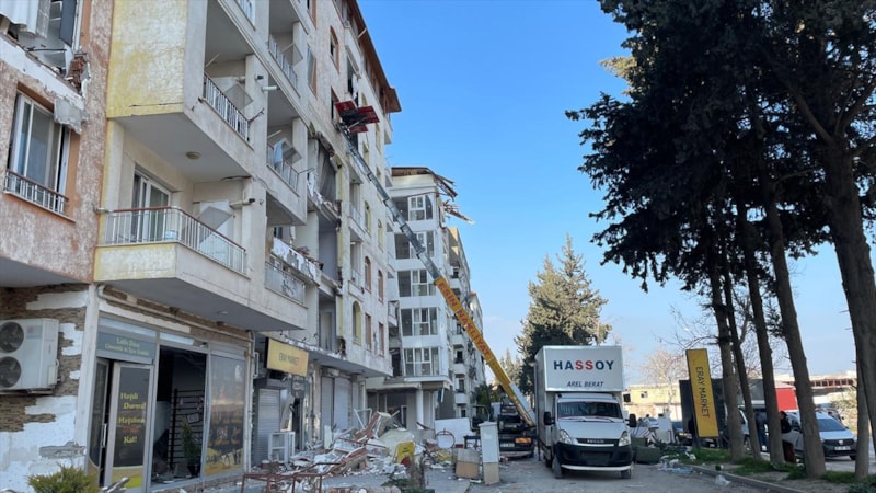 Antakya'da evleri zarar gören depremzedeler, izin aldıkları binalardan eşyalarını vinçlerle çıkarıyor.