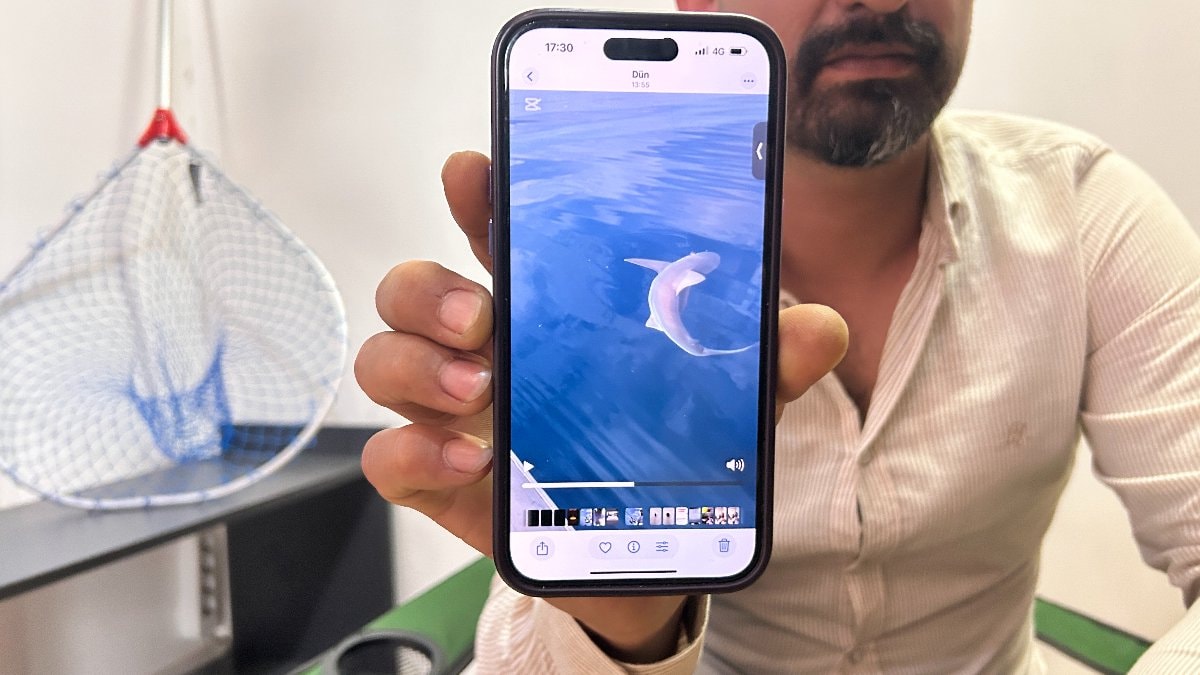 Bir süre köpek balığını inceleyen Bayar, ardından balığı tekrar denize bıraktı.