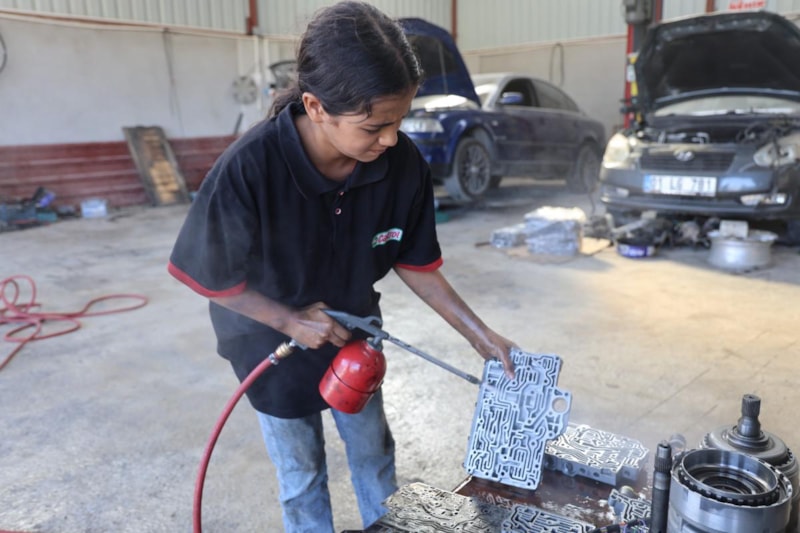 İş yerine gelenlerin gözleriyle aradığı Nehir usta, tek başına araçların bakımını yapıp, şanzıman ve motor arızalarını giderebiliyor.
