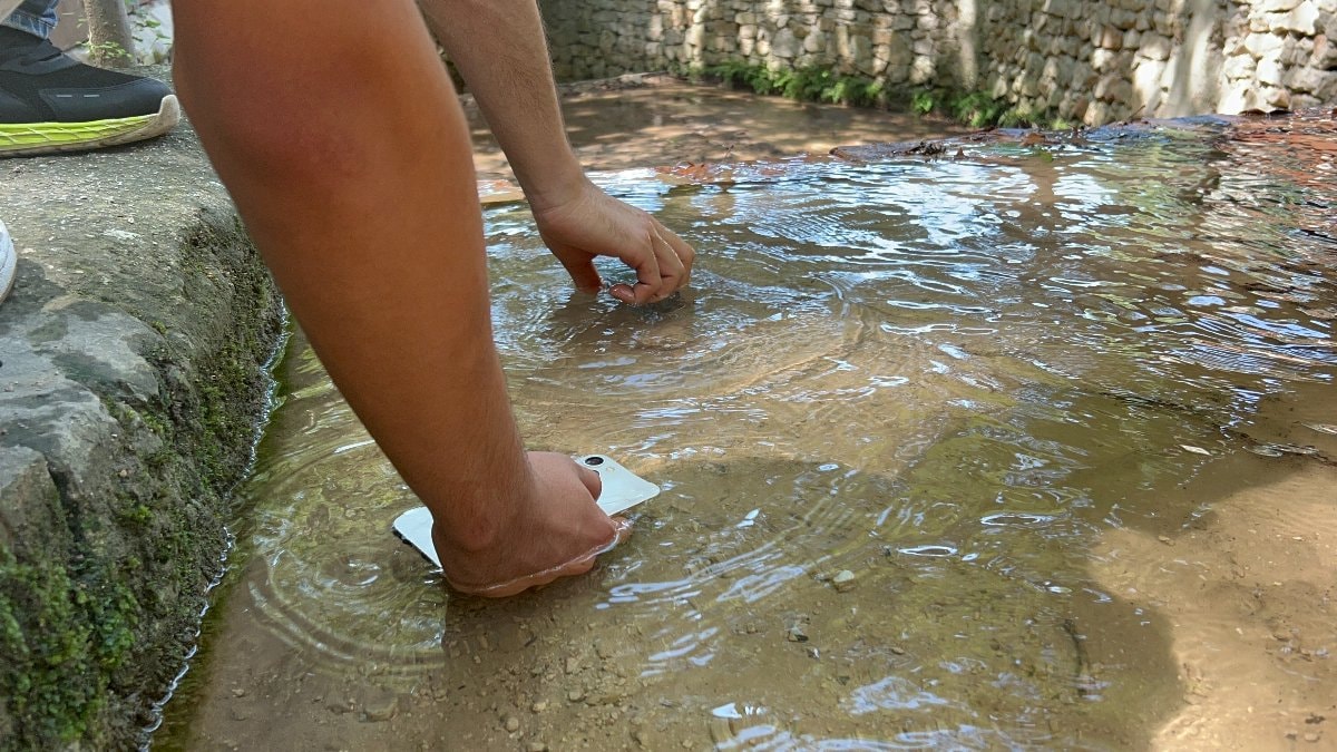 İki arkadaş, telefonlarını akarsuya sokarak serinlettiler ve kullanmaya devam ettiler.