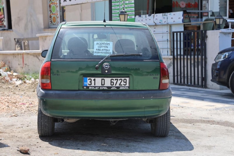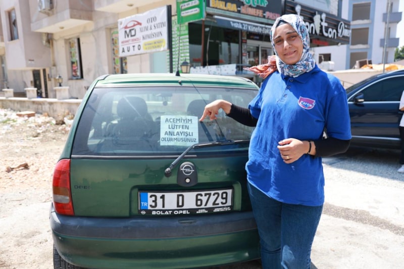 Antakya ilçesinde 14 yıldır ehliyeti olmasına rağmen korkusunu yenemeyerek trafiğe çıkamayan Pelin Tuzluoğlu, arabasının arka camına astığı "Acemiyim. Lütfen anlayışlı olur musunuz" yazısının yer aldığı not sayesinde 10 gündür trafikte araç kullanıyor.