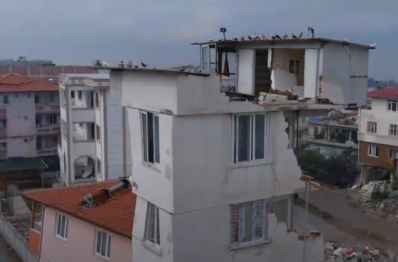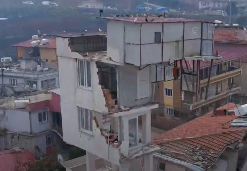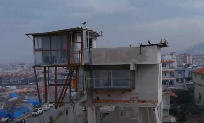 Binanın üzerindeki yapı, dün akşam merkez üssü Hatay'ın Defne ve Samandağ ilçeleri olan 6.4 ve 5.8 büyüklüğündeki depremlerden sonra da yine yıkılmadan kalmayı başardı.