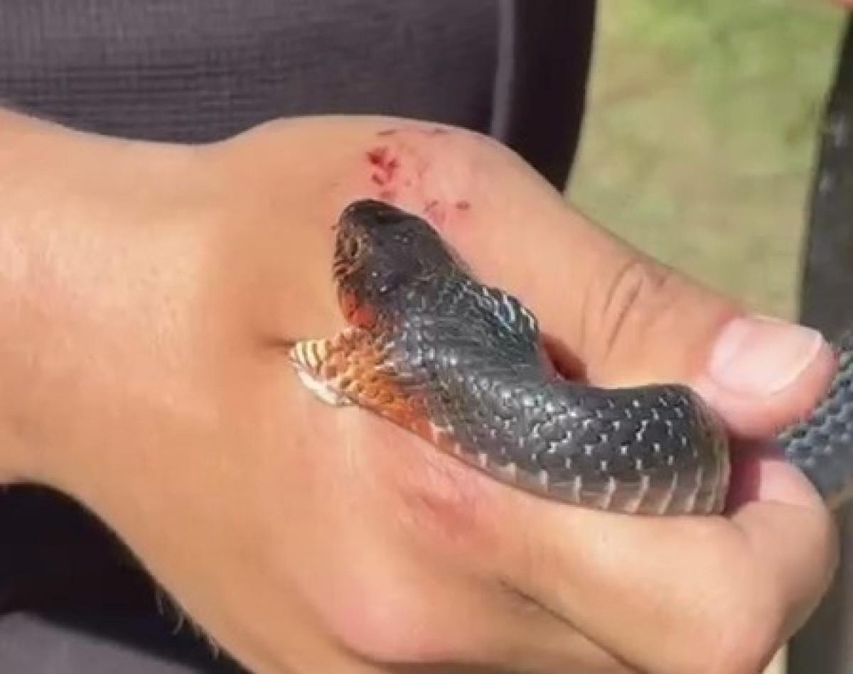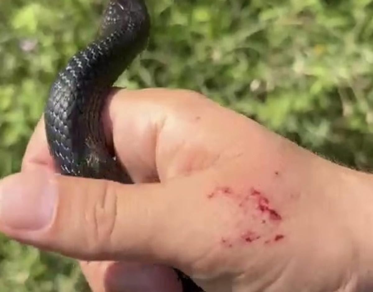 Zararsız olduğunu söylediği yılan, bir anda agresifleşerek Başer'in elini iki kez ısırdı.