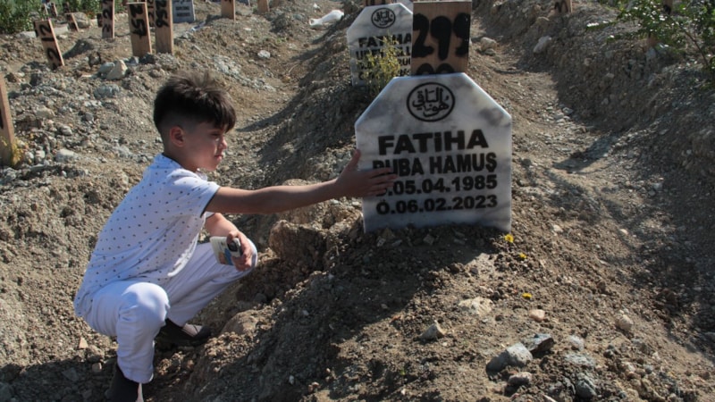 Ailesiz geçirdiği bayramın üzüntüsünü yaşayan depremzede çocuk, yakınlarıyla birlikte mezarlıktan ayrıldı.