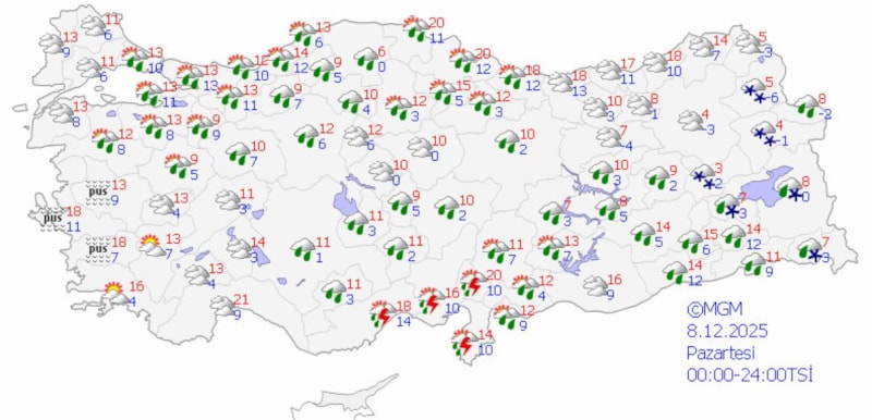 Genellikle yağmur ve sağanak, Ege ve Akdeniz kıyılarında gök gürültülü sağanak, Doğu Anadolu'nun yükseklerinde karla karışık yağmur şeklinde görülecek olan yağışların; Akdeniz, Güneydoğu Anadolu, Doğu Anadolu'nun batısı ve güneyi, İzmir ve Aydın kıyıları ile Denizli'nin güney ilçelerinde kuvvetli, Doğu Akdeniz'in iç kesimleri, Antalya, Mersin ve Muğla çevrelerinde yerel çok kuvvetli olması bekleniyor.