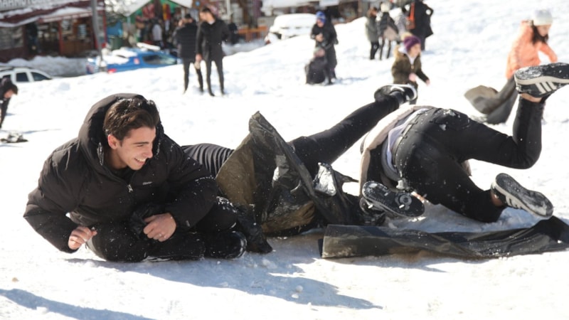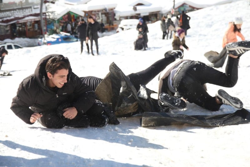 Poşet ve kızaklarla beraber yokuştan aşağıya kaydılar