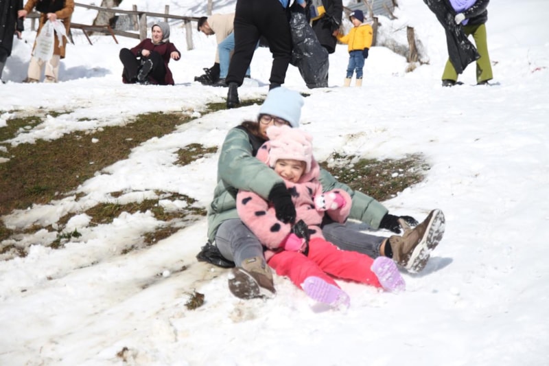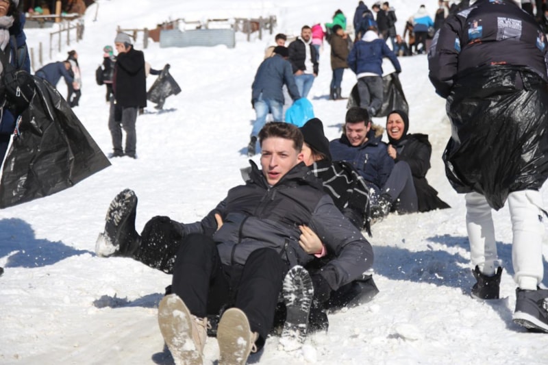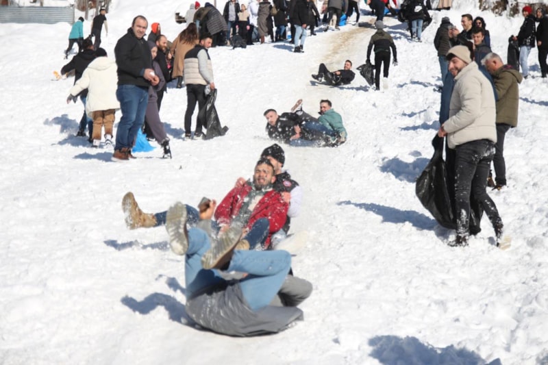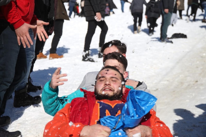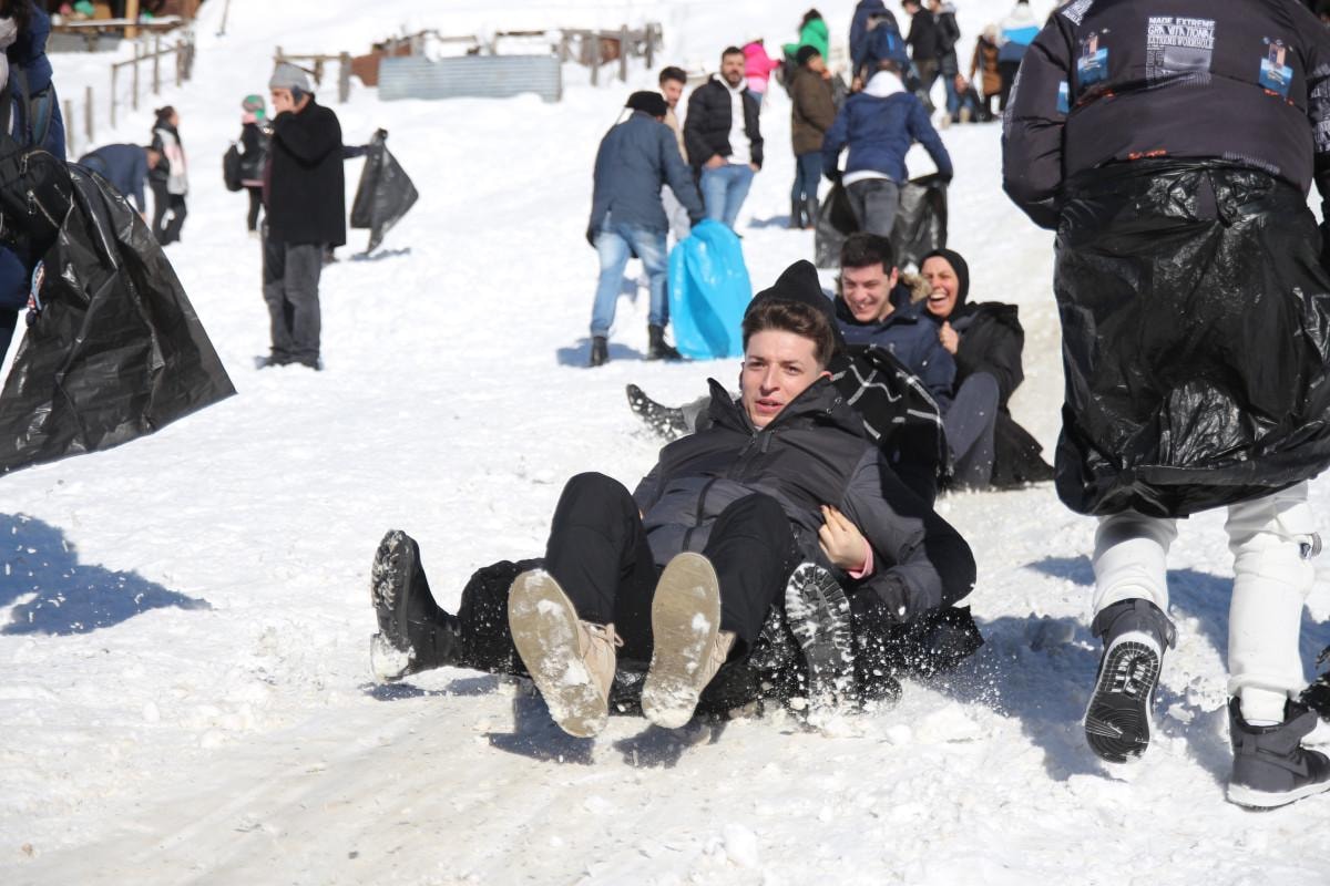Festival alanına gelen vatandaşlar yanlarında getirdikleri poşet ve kızaklarla beraber yokuştan aşağıya kayarak keyifli vakit geçirdi.