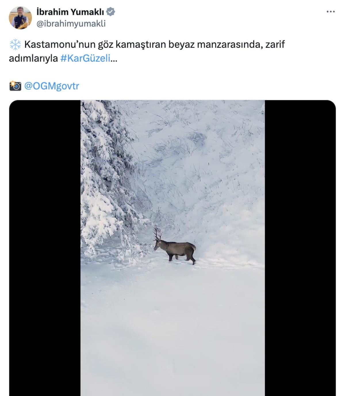 Tarım ve Orman Bakanı İbrahim Yumaklı, Kastamonu'da karla kaplı doğal yaşam alanında görüntülenen geyiği paylaştı.