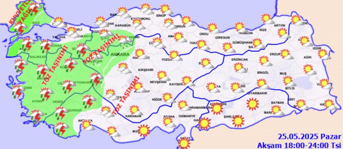 25 Mayıs Pazar günü akşam saatlerinden itibaren Edirne, Tekirdağ, Kırklareli ve Çanakkale, 26 Mayıs Pazartesi günü ilk saatlerden itibaren İstanbul, Yalova, Balıkesir, Bursa, İzmir ve Manisa, öğle saatlerinden itibaren Kocaeli, Sakarya ve Bilecik çevrelerinde aralıklı ve yerel olarak kuvvetli sağanak ve gök gürültülü sağanak yağış beklenmektedir.