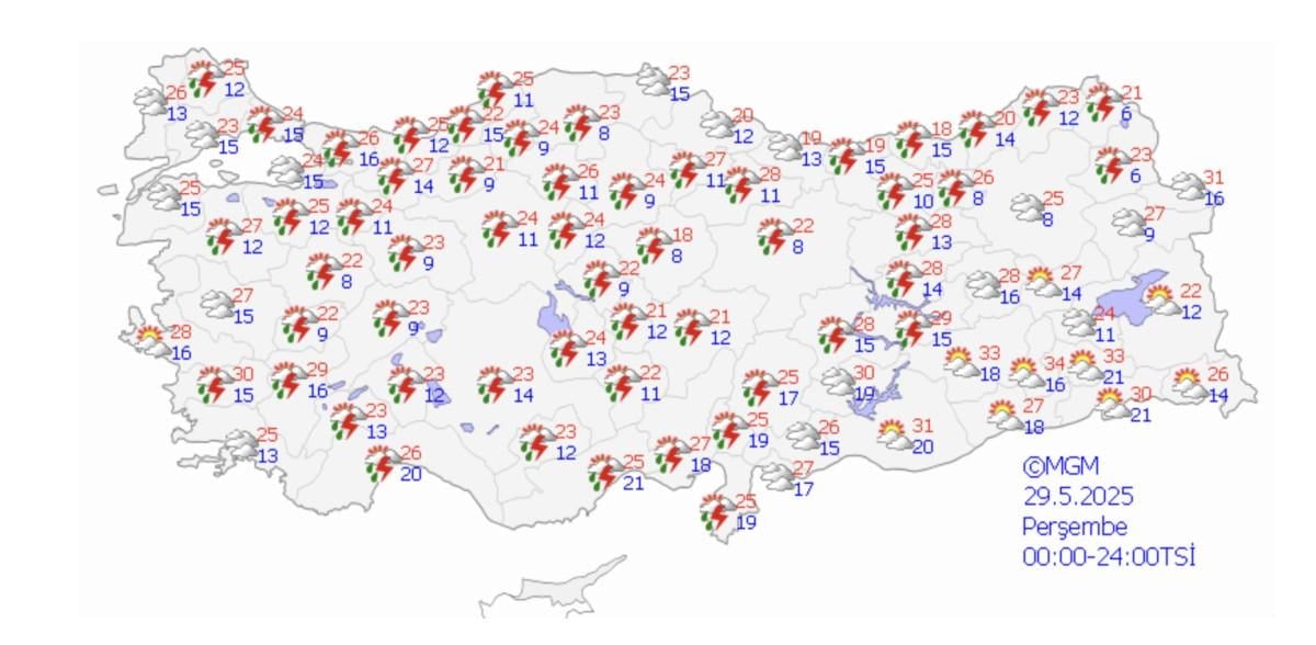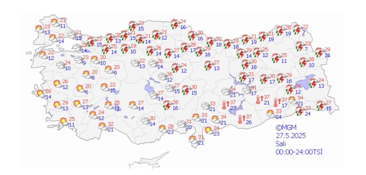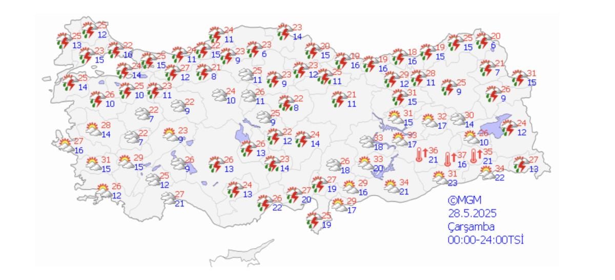 Meteoroloji Genel Müdürlüğü'nden alınan son bilgilere göre; 26 Mayıs 2025 tarihinde beklenen gök gürültülü sağanak yağış ve fırtına nedeniyle; 38 ilimiz için sarı uyarı verilmiştir.