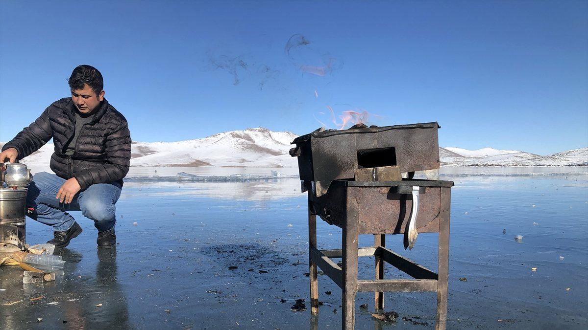 Iğdır'dan gelerek gölün buzla kaplı yüzeyinde mangal yapan ziyaretçilerden Vahap Arslan, doğada olmanın kendileri için bir tutku olduğunu belirtti.