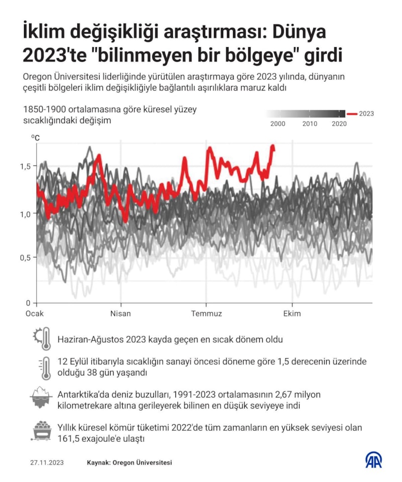 Raporda; 2023'ün, iklim değişikliğiyle bağlantılı aşırılıkların dünyanın çeşitli yerlerinde kayda geçtiği bir yıl olduğu belirtilerek, rekor sıcaklıklar, okyanusların ısınmaya devam etmesi, Kuzey Atlantik deniz suyu yüzeyinin sıcaklığındaki artış ve Antarktika’daki buzul seviyesinin eşi benzeri görülmemiş şekilde düşük oranlara gerilemesi bu aşırılıklardan bazıları olarak sıralandı.