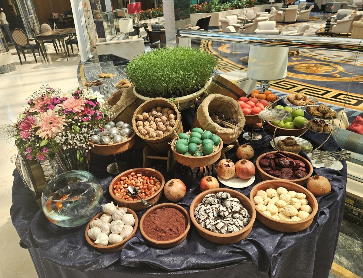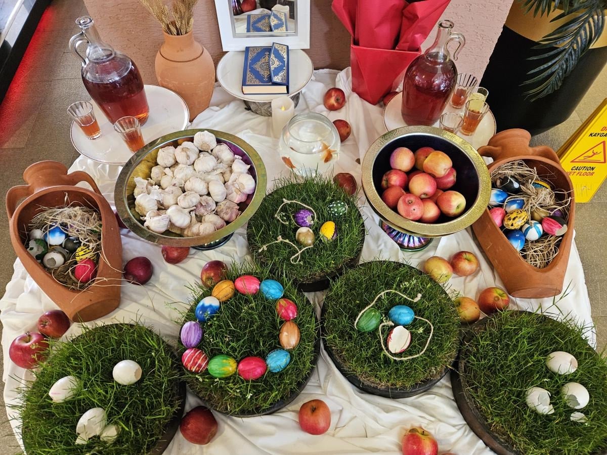 Masalarda; doğurganlık, sağlık ve şifayı temsilen sarımsak, sabrı, yaşlanmayı ve zamanın geçişini sembolize eden sirke, güzelliği ve sağlığı sembolize eden elma, sevgiyi sembolize eden kuru meyve, iyiliğin kötülüğe zaferini ve yükselen güneşi sembolize eden sumak, yeniden doğuşu, bebekliği ve hayatı sembolize eden filizlenmiş buğday gibi ürünler bulunuyor.