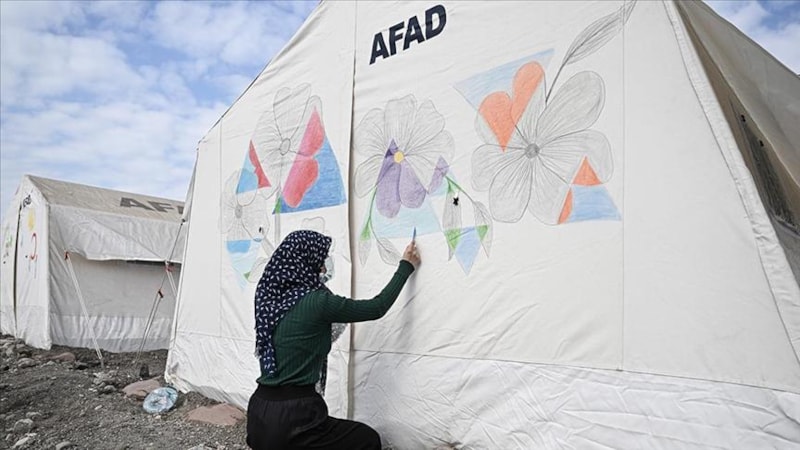 Hatay'ın İskenderun ilçesinde, evleri hasar gördüğü için geçici barınma alanlarında kalan ailelerin çocukları, çadırların dışını resimlerle süslüyor.