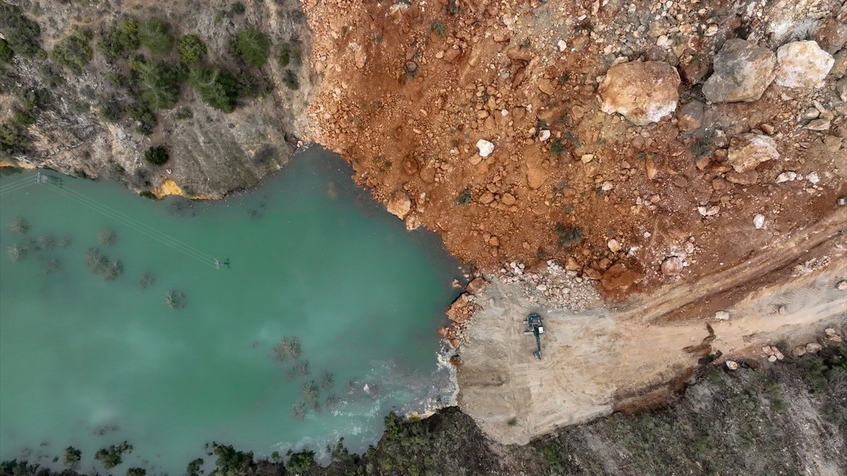 Devlet Su İşleri ekipleri ve ilgili kurumların görevlileri, heyelan sonucu önünde set oluşan deredeki suyun kontrollü tahliyesi için iş makineleriyle çalışmalar yürütüyor.