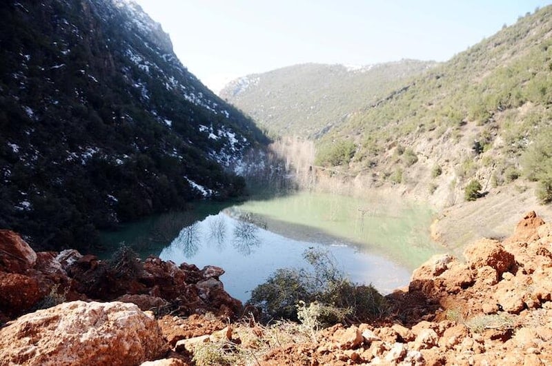 Gaziantep'in İslahiye ilçesinde sallantılar sonrası karşı karşıya olan iki dağ birleşti, dere yatağını dolduran kaya parçaları nedeniyle eriyen kar sularından göl oluştu.