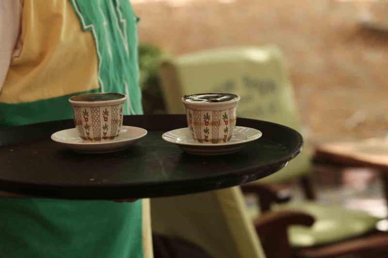 Kahve tadılırken suyu ve telvesi birlikte içiliyor.