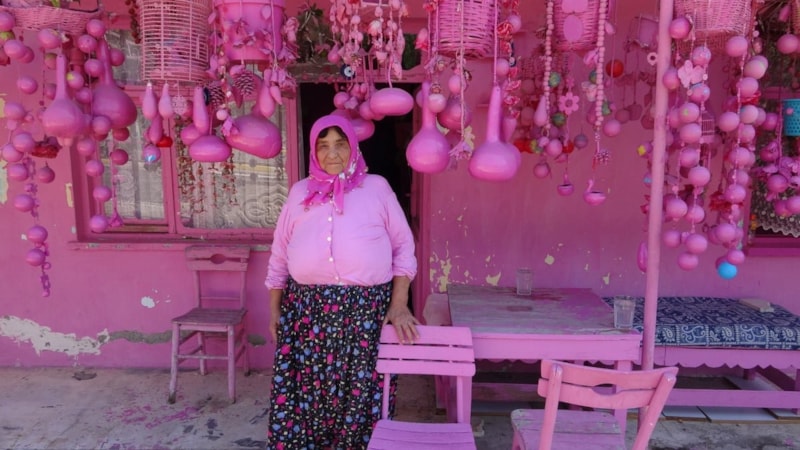 Yaşadığı evin her detayını pembeye boyayan Sakine Teyze, pembe eviyle dikkat çekiyor.