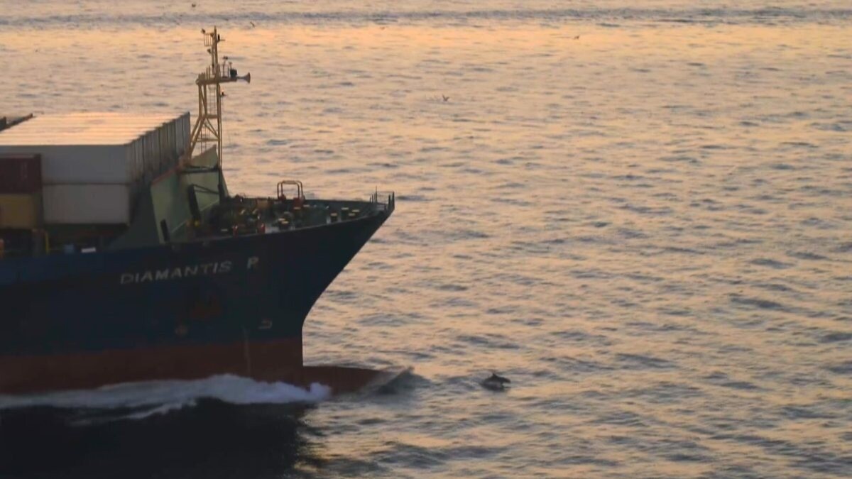 İstanbul Boğazı’ndan geçen dev gemilerin bazılarıyla oyun oynarcasına yüzen yunuslar, havadan görüntülendi.